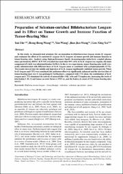 In this study, we demonstrated selenium (Se) accumulation in Bifidobacterium longum strain (B. longum)and evaluated the effect of Se-enriched B. longum (Se-B. longum) on tumor growth and immune function intumor-bearing mice. Analysis using high-performance liquid chromatography-inductively coupled plasmamass spectrometry (HPLC-ICP-MS) revealed that more than 99% of Se in Se-B. longum was organic, the maincomponent of which was selenomethionine (SeMet). In the in vivo experiments, tumor-bearing mice (n=8) wereorally administrated with different doses of Se-B. longum alone or combined with cyclophosphamide (CTX).The results showed that the middle and high dose of Se-B. longum significantly inhibited tumor growth. WhenSe-B. longum and CTX were combined, the antitumor effect was significantly enhanced and the survival time oftumor-bearing mice (n=12) was prolonged. Furthermore, compared with CTX alone, the combination of Se-B.longum and CTX stimulated the activity of natural killer (NK) cells and T lymphocytes, increasing the levels ofinterleukin-2 (IL-2) and tumor necrosis factor-α (TNF-α), and the leukocyte count of H22 tumor-bearing mice(n=12).