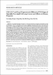 Objective: To investigate the effects of CD4+, IL17 and Foxp3 expression on prognosis of operable non-smallcell lung cancer (NSCLC) with different pTNM stages. Methods: Expression of CD4+, IL17 and Foxp3 in 102cases of NSCLC tissues and adjacent cancer tissues was detected by immunohistochemistry and associationswith prognosis with different pTNM stages were analyzed. The Chi-square test was used to compare count data.Survival differences were evaluated by Kaplan-Meier single factor analysis and the COX regression model wasused to analyze the relationship between influential factors and the disease prognosis. The significance level wasα = 0.05. Results: Expression of CD4, IL-17 and Foxp3 significantly varied in different pTNM stages of NSCLCtissues (P Conclusions: Surgical prognosisof NSCLC can be better assessed by the combination of clinical staging and expression of IL17 and Foxp3.
