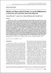 Colorectal cancer (CRC) is a worldwide health problem, being the third most commonly detected cancerin males and the second in females. Rising CRC incidence trends are mainly regarded as a part of the rapid‘Westernization’ of life-style and are associated with calorically excessive high-fat/low-fibre diet, consumptionof refined products, lack of physical activity, and obesity. Most recent epidemiological and clinical investigationshave consistently evidenced a significant relationship between obesity-driven inflammation in particular stepsof colorectal cancer development, including initiation, promotion, progression, and metastasis. Inflammation inobesity occurs by several mechanisms. Roles of imbalanced metabolism (MetS), distinct immune cells, cytokines,and other immune mediators have been suggested in the inflammatory processes. Critical mechanisms areaccounted to proinflammatory cytokines (e.g. IL-1, IL-6, IL-8) and tumor necrosis factor-α (TNF-α). Thesemolecules are secreted by macrophages and are considered as major agents in the transition between acute andchronic inflammation and inflammation-related CRC. The second factor promoting the CRC development inobese individuals is altered adipokine concentrations (leptin and adiponectin). The role of leptin and adiponectinin cancer cell proliferation, invasion, and metastasis is attributable to the activation of several signal transductionpathways (JAK/STAT, mitogen-activated protein kinase (MAPK), phosphatidylinositol 3 kinase (PI3K), mTOR,and 5’AMPK signaling pathways) and multiple dysregulation (COX-2 downregulation, mRNA expression).
