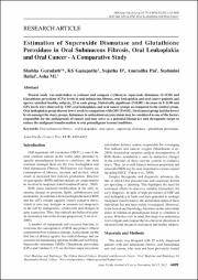 Present study was undertaken to estimate and compare erythrocyte superoxide dismutase (E-SOD) andGlutathione peroxidase (GPx) levels in oral submucous fibrosis, oral leukoplakia and oral cancer patients andage/sex matched healthy subjects, 25 in each group. Statistically significant (P0.05). Oral cancer group had the lowestlevels amongst the study groups. Imbalance in antioxidant enzyme status may be considered as one of the factorsresponsible for the pathogenesis of cancer and may serve as a potential biomarker and therapeutic target toreduce the malignant transformation in oral premalignant lesions/conditions.