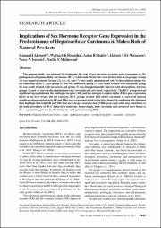 The present study was planned to investigate the role of sex hormone receptor gene expression in thepathogenesis of hepatocellular carcinoma (HCC). Adult male Wistar rats were divided into seven groups. Group(1) was negative control. Groups (2), (5), (6), and (7) were orally administered with N-nitrosodiethylamine forthe induction of HCC, then group (2) was left untreated, group (5) was orally treated with curcumin, group(6) was orally treated with carvacrol, and group (7) was intraperitoneally injected with doxorubicin, whereasgroups (3) and (4) were orally administered only curcumin and carvacrol, respectively. The HCC group showedsignificant upregulation in the androgen receptor (AR) and the estrogen receptor-alpha (ERα) gene expressionlevels in the liver tissue. On the contrary, HCC groups treated with either curcumin or carvacrol showedsignificant downregulation in AR and ERα gene expression levels in the liver tissue. In conclusion, the obtaineddata highlight that both AR and ERα but not estrogen receptor-beta (ERβ) gene expression may contribute tothe male prevalence of HCC induced in male rats. Interestingly, both curcumin and carvacrol were found tohave a promising potency in alleviating the male predominating HCC.