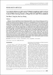 Objective: The aim of this Human Genome Epidemiology (HuGE) review and meta-analysis was to derive amore precise estimation of the association between p53 codon 72 polymorphism (Arg72Pro, rs1042522 G>C) andcervical cancer risk among Asians. C) andcervical cancer risk among Asians. Methods: A literature search of Pubmed, Embase, Web of Science and CBMdatabases from inception through June 2012 was conducted. The meta-analysis was performed using STATA12.0 software. Crude odds ratios (ORs) with 95% confidence intervals (CIs) were used to assess the strength ofany association. Twenty-eight case-control studies were included with a total of 3,580 cervical cancer cases and3,827 healthy controls. When all the eligible studies were pooled into the meta-analysis, the results showed thatthe Pro/Pro genotype was associated with increased risk of cervical cancer under the heterozygous model (Pro/Pro vs. Arg/Pro: OR = 1.25, 95%CI: 1.02-1.53, P= 0.005). However, no statistically significant associations werefound under four other genetic models (Pro vs. Arg: OR = 0.97, 95%CI: 0.85-1.10, P= 0.624; Pro/Pro + Arg/Pro vs. Arg/Arg: OR = 0.84, 95%CI: 0.70-1.01, P= 0.058; Pro/Pro vs. Arg/Arg + Arg/Pro: OR = 1.13, 95%CI:0.92-1.39, P= 0.242; Pro/Pro vs. Arg/Arg: OR = 0.97, 95%CI: 0.76-1.22, P= 0.765; respectively). In the subgroupanalysis based on country, the Pro/Pro genotype and Pro carrier showed significant associations with increasedrisk of cervical cancer among Indian populations, but not among Chinese, Japanese and Korean populations.Conclusion: Results from the current meta-analysis suggests that p53 codon 72 polymorphism might be associatedwith increased risk of cervical cancer, especially among Indians.