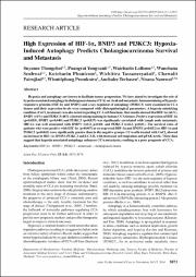 Hypoxia and autophagy are known to facilitate tumor progression. We here aimed to investigate the role ofhypoxia-associated autophagy in cholangiocarcinoma (CCA) survival and metastasis. Immunostaining of hypoxicresponsiveproteins (HIF-1α and BNIP3) and a key regulator of autophagy (PI3KC3) were examined in CCAtissues and their expression levels were compared with clinicopathological parameters. A hypoxia mimickingcondition (CoCl2 treatment) was also tested regarding CCA cell functions. Our results showed that HIF-1α (66%),BNIP3 (44%) and PI3KC3 (46%) showed strong staining in human CCA tissues. Positive expression of HIF-1α(p=0.033), BNIP3 (p=0.040) and PI3KC3 (p=0.037) was significantly correlated with lymph node metastasis.HIF-1α was well associated with BNIP3 (r=0.3, p