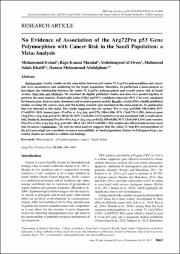 Background: Earlier studies on the association between p53 codon 72 Arg>Pro polymorphism and cancerrisk were inconclusive and conflicting for the Saudi population. Therefore, we performed a meta-analysis toinvestigate the relationship between the codon 72 Arg>Pro polymorphism and overall cancer risk in SaudiArabia. Materials and Pro polymorphism and cancerrisk were inconclusive and conflicting for the Saudi population. Therefore, we performed a meta-analysis toinvestigate the relationship between the codon 72 Arg>Pro polymorphism and overall cancer risk in SaudiArabia. Materials and Pro polymorphism and overall cancer risk in SaudiArabia. Materials and Methods: We searched all eligible published studies and data were pooled together toperform the meta-analysis. Pooled odds ratios (ORs) and 95% confidence intervals (95% CIs) were calculatedfor homozygous, heterozygous, dominant and recessive genetic models. Results: A total of five eligible publishedstudies covering 502 cancer cases and 784 healthy controls were included in the meta-analysis. No publicationbias was detected in this study. The results suggested that the variant (Pro vs Arg: p=0.960; OR=1.004, 95%CI=0.852-1.183), homozygous (Pro.Pro vs Arg.Arg: p=0.970; OR=1.006, 95% CI=0.729-1.390), heterozygous(Arg.Pro vs Arg.Arg: p=0.473; OR=0.783, 95% CI=0.402-1.527) carriers were not associated with overall cancerrisk. Similarly, dominant (Pro.Pro+Pro.Arg vs Arg.Arg: p=0.632; OR=0.886, 95% CI=0.540-1.454) and recessive(Pro.Pro vs Pro.Arg+Arg.Arg: p=0.269; OR=1.163, 95%CI=0.890-1.521) models also did not indicate increasedrisk of cancer. Conclusions: The current meta-analysis suggests that the codon 72 Arg>Pro polymorphism ofthe p53 gene might not contribute to cancer susceptibility in Saudi population. Future well designed large casecontrol studies are needed to validate our findings.