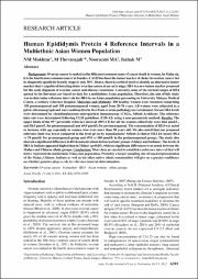 Background: Ovarian cancer is ranked as the fifth most common cause of cancer death in women. In Malaysia,it is the fourth most common cancer in females. CA125 has been the tumor marker of choice in ovarian cancer butits diagnostic specificity in early stages is only 50%. Hence, there is a critical need to identify an alternative tumormarker that is capable of detecting detect ovarian cancer at an early stage. HE4 is a new tumor marker proposedfor the early diagnosis of ovarian cancer and disease recurrence. Currently, none of the normal ranges of HE4quoted in the literature are based on data for a multiethnic Asian population. Therefore, the aim of this studywas to determine reference intervals for HE4 in an Asian population presenting in University Malaya MedicalCentre, a tertiary reference hospital. Materials and Methods: 300 healthy women were recruited comprising150 premenopausal and 150 postmenopausal women, aged from 20-76 years. All women were subjected to apelvic ultrasonograph and were confirmed to be free from ovarian pathology on recruitment. Serum HE4 levelswere determined by chemiluminescent microparticle immunoassay (CMIA, Abbott Architect). The referenceintervals were determined following CLSI guidelines (C28-A2) using a non-parametric method. Results: Theupper limits of the 95th percentile reference interval (90%CI) for all the women collectively were 64.6 pmol/L,and 58.4 pmol/L for premenopausal) and 69.0 pmol/L for postmenopausal. The concentration of HE4 was notedto increase with age especially in women who were more than 50 years old. We also noted that our proposedreference limit was lower compared to the level given by manufacturer Abbott Architect HE4 kit insert (58.4vs 70 pmol/L for premenopausal group and 69.0 vs 140 pmol/L in the postmenopausal group). The study alsoshowed a significant difference in HE4 concentrations between ethnic groups (Malays and Indians). The levels ofHE4 in Indians appeared higher than in Malays (pConclusions: More data are needed to establish a reference interval that willbetter represent the multiethnic Malaysian population. Probably a larger sampling size of equal representationof the Malay, Chinese, Indians as well as the other native ethnic communities will give us a greater confidenceon whether genetics plays a role in reference interval determination.