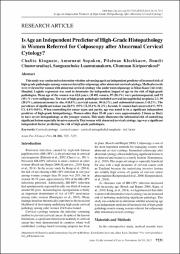 This study was conducted to determine whether advancing age is an independent predictor of increased risk ofhigh-grade pathologies among women referred for colposcopy after abnormal cervical cytology. Medical recordswere reviewed for women with abnormal cervical cytology who underwent colposcopy at Khon Kaen UniversityHospital. Logistic regression was used to determine the independent impact of age on the risk of high-gradepathologies. Mean age of the women was 42.8 years. Of 482 women, 97 (20.1%) were postmenopausal, and 92(19.1%) were nulliparous. The rate of high-grade pathologies included cervical intraepithelial neoplasia 2-3, 99(20.5%), adenocarcinoma in situ, 4 (0.8%), cervical cancer, 30 (6.2%), and endometrial cancer, 1 (0.2%). Theprevalence of significant lesions was 26.9% (95% CI, 23.1%-31.2%). In total, 31 women had cancers (6.4%; 95%CI, 4.4%-9.0%). When controlling for smear types and parity, age was noted to be a significant independentpredictor of high-grade histopathology. Women older than 35-40 years were approximately 2 times as likelyto have severe histopathology as the younger women. This study illustrates the substantial risk of underlyingsignificant lesions especially invasive cancer in Thai women with abnormal cervical cytology. Age was a significantindependent factor predicting the risk of high-grade pathologies.