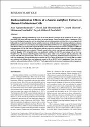 Background: Although radiotherapy is one of the most effective strategies in the treatment of cancers, it isassociated with short and long term side effects on normal tissues. Zataria multiflora Boiss (Laminacea) (ZM)has several biological properties such as antioxidant and anti-inflammation activities.Here we investigated cellkilling effects of a hydroalcoholic Zataria multiflora extract on cell death induced by ionizing radiation in a humanglioblastoma cell line (A172) and human non-malignant fibroblasts (HFFF2) in vitro. Materials and Methods: A172and HFFF2 cells were treated with a hydroalcoholic extract of dried aerial parts of Zataria multiflora at differentconcentrations (25, 50, 100, 150 and 200 μg/ml) and then exposed to ionizing radiation (IR). Cell proliferationand DNA fragmentation were evaluated. Thymol content in the extract was analyzed and quantified by HPLCmethods. Results: A172 cell proliferation was significantly inhibited by ZM. The percentage cell survival was91.8±8.57 for cells treated with 200 μg/ml of ZM extract alone while it was 76.0±4.27 and 66.2±8.42 for cellstreated with ZM and exposed to IR at doses of 3Gy and 6Gy, respectively. Radiation-induced apoptosis in A172cells was significantly increased following treatment with ZM at doses of 200 μg/ml. ZM extract did not exhibitany enhanced cell killing effects and apoptosis caused by IR on HFFF2 cells. Conclusions: These data showselective radiosensitization effects of ZM in A172 cells apparently due to increased radiation-induced apoptosis.