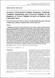 Background: To determine the accuracy of preoperative urinary symptoms, urinalysis, computed tomography (CT) and cystoscopic findings for the diagnosis of urinary bladder invasion in patients with colorectal cancer. Materials and Methods: Records of patients with colorectal cancer and a suspicion of bladder invasion, who underwent tumor resection with partial or total cystectomy between 2002 and 2013 at the Faculty of Medicine Siriraj Hospital, were reviewed. Correlations between preoperative urinary symptoms, urinalysis, cystoscopicfinding, CT imaging and final pathological reports were analyzed. Results: This study included 90 eligible cases (71% male). The most common site of primary colorectal cancer was the sigmoid colon (44%), followed by the rectum (33%). Final pathological reports showed definite bladder invasion in 53 cases (59%). Significant features for predicting definite tumor invasion were gross hematuria (OR 13.6, sensitivity 39%, specificity 73%), and visible tumor during cystoscopy (OR 5.33, sensitivity 50%, specificity 84%). Predictive signs in CT imagingwere gross tumor invasion (OR 7.07, sensitivity 89%, specificity 46%), abnormal enhancing mass at bladder wall (OR 4.09, sensitivity 68%, specificity 66%), irregular bladder mucosa (OR 3.53, sensitivity 70%, specificity 60% ), and loss of perivesical fat plane (OR 3.17, sensitivity 81%, specificity 43%). However, urinary analysis and other urinary tract symptoms were poor predictors of bladder involvement. Conclusions: The present study demonstrated that the most relevant preoperative predictors of definite bladder invasion in patients with colorectal cancer are gross hematuria, a visible tumor during cystoscopy, and abnormal CT findings.