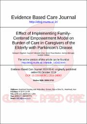Background: Caring for a patient with Parkinson's disease (PD) imposes a high burden of care on caregivers due to its chronic and progressive nature. Implementation of an empowerment program leads to self-control and adoption of preventive behaviors. Aim: This study investigated the effect of a family-centered empowerment model on the burden of care among the caregivers of the elderly with PD. Method: The present randomized controlled clinical trial was performed on 60 caregivers and elderly people with PD referring to the Neurology Clinic of one of the two large hospitals of Mashhad, northeast Iran, in 2018. In the intervention group, the family-centered empowerment model consisted of four steps, including perceived threat, problem-solving, educational participation, and evaluation, in four training sessions. Before and 1.5 months after the training sessions, both groups completed the Zarit Burden Interview questionnaire. The control group also received routine care. The data were analyzed by SPSS software (version 16) using paired t-test, independent t-test, Wilcoxon test, and Mann-Whitney U test. Results: The two groups were homogeneous regarding demographic findings. The difference in pre and postcare burden scores decreased 25.1±13.9 and 0.6±3.1 in the intervention and control groups, respectively. Independent t-test showed a significant difference (P Implications for Practice: Using the empowerment model focusing on the management of care programs leads to reducing the burden of care and improving the role of caregivers. Therefore, it is recommended to implement family-centered empowerment programs for the caregivers of patients with chronic diseases.