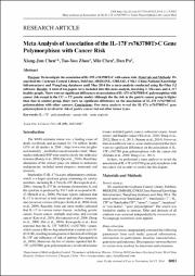 Purpose: To investigate the association of IL-17F rs763780T>C with cancer risk. Materials and C with cancer risk. Materials and Methods: Wesearched the Cochrane Central Library, PubMed, MEDLINE, EMBASE, CNKI (China National KnowledgeInfrastructure) and WangFang databases until May 2014 for a meta-analysis conducted using RevMan 5.2software. Results: A total of ten papers were included into this meta analysis, involving 3, 336 cases and 4, 217healthy people. There were no significant differences on association of IL-17F rs763780T>C polymorphism withcancer risk except in the CC vs TT genetic model. Although the the risk in the gastric cancer group is higherthan that in control group, there were no significant differences on the association of IL-17F rs763780T>Cpolymorphism with other cancers. C polymorphism withcancer risk except in the CC vs TT genetic model. Although the the risk in the gastric cancer group is higherthan that in control group, there were no significant differences on the association of IL-17F rs763780T>Cpolymorphism with other cancers. Cpolymorphism with other cancers. Conclusions: Our meta analysis reveal the IL-17A rs763780T>C genepolymorphism is involved in risk of gastric cancer but not other tumor types.