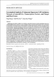 Background: MicroRNAs (miRNAs) are small non-coding RNA molecules found in multicellular eukaryoteswhich are implicated in development of cancer, including cutaneous squamous cell carcinoma (cSCC). Expressionis controlled by transcription factors (TFs) that bind to specific DNA sequences, thereby controlling the flow(or transcription) of genetic information from DNA to messenger RNA. Interactions result in biological signalcontrol networks. Materials and Methods: Molecular components involved in cSCC were here assembledat abnormally expressed, related and global levels. Networks at these three levels were constructed withcorresponding biological factors in term of interactions between miRNAs and target genes, TFs and miRNAs,and host genes and miRNAs. Up/down regulation or mutation of the factors were considered in the context ofthe regulation and significant patterns were extracted. Results: Participants of the networks were evaluatedbased on their expression and regulation of other factors. Sub-networks with two core TFs, TP53 and EIF2C2,as the centers are identified. These share self-adapt feedback regulation in which a mutual restraint exists. Upor down regulation of certain genes and miRNAs are discussed. Some, for example the expression of MMP13,were in line with expectation while others, including FGFR3, need further investigation of their unexpectedbehavior. Conclusions: The present research suggests that dozens of components, miRNAs, TFs, target genesand host genes included, unite as networks through their regulation to function systematically in human cSCC.Networks built under the currently available sources provide critical signal controlling pathways and frequentpatterns. Inappropriate controlling signal flow from abnormal expression of key TFs may push the system intoan incontrollable situation and therefore contributes to cSCC development.