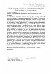 زبانشناسی کارکردگرا، با تحلیل عناصر بافتی و تکیه بر رویکردی کاربردبنیاد (usage-based)، به تحلیل زبان می پردازد. تبیین معناشناختی-کاربردشناختی دو نقش ترکیبیِ فاعل؛ به عنوان مقصود اصلی نمای نقشی جمله، و مفعول؛ به عنوان مقصود ثانویه جمله، بر اساس این رویکرد، موضوع پژوهش حاضر است. نگارنده تلاش دارد، تا با روش توصیفی- تحلیلی و بر اساس مفاهیم کاربردشناختی و معناشناختیِ نحو کاربردیِ (FG) سیمون دیک، به تحلیل نقشهای ترکیبی زبان عربی؛ به عنوان زبانی فاعل تهی(null sub)، ضمیر انداز(drop-pro) و با چیدمان واژگانی آزاد (free word order)بپردازد. نتایج پژوهش نشان می دهد، در زبان عربی نقش فاعل، میتواند در سطح معناشناختی به سازه های کنشگر، کنش پذیر، هدف و وابسته های زمان و مکان اسناد داده شود. همچنین، در سطح کاربردشناختی، مبتداسازی از بستر فاعلی«subject LD» یا کانونی سازی«Focusing»، از طریق جابجایی این سازه به ابتدای جمله صورت می پذیرد. نقش ترکیبی مفعول نیز میتواند به سازه های کنش پذیر، هدف و وابستهای زمانی و مکانی اسناد داده شود. در سطح کاربردشناختی نیز، به صورت مبتداسازی ضمیرگذار«clitic LD»، یا کانونی سازی بهکار برده میشود. اما، سازه ای که به عنوان مفعولِ غیر مستقیم در نحو سنتی شناخته میشود، در نحو کاربردی، میتواند در ترکیبهای «ملکی» و «تعلیلی»، از نقش معناشناختی«هدف»، و در ترکیبهای ارتقائی، از نقش معناشناختیِ«کنش پذیر/ بهره ور» برخوردار باشد. مبتداسازی و کانوی سازی در این سازه نیز، از طریق انتقال به ابتدای جمله صورت میگیرد.