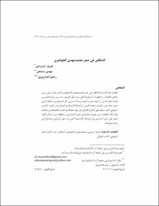 تطرقت هذه الدراسة التناقض فی شعر محمدمهدی الجواهری الذی عاش فی زمن مخاض الحوادث و التطورات السیاسیة، التی مرت علی العراق بدءً من ثورة العشرین بقیادة علماء الدین، و انتهاءً بحزب البعث و صدام حسین. کان الجواهری متناقضاً فی شعره تجاه حزب البعث، و علماء الدین، و الحرکة الاسلامیة المعاصرة، و المد الأحمر الشیوعی الذی سیطر علی الشارع العراقی فی عهد عبدالکریم قاسم. فللجواهری مواقف تجاه تلک الحوادث تبرز بصورة ساخرة فی شعره السیاسی، و مواقفه من خلال القاء الضوء علی شعره السیاسی فی المراحل التاریخیة، التی مرّت علی العراق و تحتاج الی رؤیة موضوعیة.
