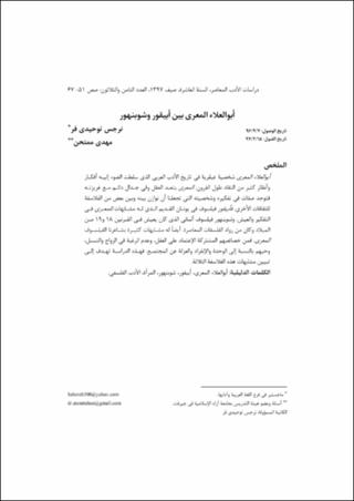 أبوالعلاء المعری شخصیة عبقریة فی تاریخ الأدب العربی الذی سلطت الضوء إلیه أفکار وأنظار کثیر من النقاد طول القرون. المعری یتعبد العقل وفی جدال دائم مع غریزته فتوجد صفات فی تفکیره وشخصیته التی تجعلنا أن نوازن بینه وبین بعض من الفلاسفة للثقافات الأخری. فأبیقور فیلسوف فی یونان القدیم الذی له مشابهات للمعری فی التفکیر والعیش. وشوبنهور فیلسوف ألمانی الذی کان یعیش فی القرنین 18 و19 من المیلاد وکان من رواد الفلسفات المعاصرة. أیضاً له مشابهات کثیرة بشاعرنا الفیلسوف المعری. فمن خصائصهم المشترکة الإعتماد علی العقل، وعدم الرغبة فی الزواج والنسل، وحبهم بالنسبة إلی الوحدة والإنفراد والعزلة عن المجتمع. فهذه الدراسة تهدف إلی تبیین مشابهات هذه الفلاسفة الثلاثة.