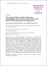 In this study, AuPdCu-rGO-MWCNTs nanocomposite was synthesised by a chemical reduction method which was applied to fabricate an electrochemical sensor for simultaneous determination Dopamine (DA), Acetaminophen (AC) and Tryptophan (Trp) by cyclic voltammetry (CV) and differential pulse voltammetry (DPV) techniques. The formation of Au, Pd, and Cu nanoparticles on rGO-MWCNTs nanocomposite are characterized by XRD, FTIR, and SEM techniques. The relationship between the concentration of DA, AC, and Trp with the response of AuPdCu-rGO-MWCNTs/CPE was linear in the range of 10 nM to 8.3 μM, 20 nM to 12.5 μM and 10 nM to 9.4 μM by DPV technique, and 0.007-8.0, 0.011-11.6 and 0.008-8.8 μM by amperometric method, respectively. Also, the detection limits for DA, AC, and Trp were calculated to be 3, 7 and 4 nM, respectively by the voltammetric method and 2, 5 and 3 nM for DA, AC and Trp, by amperometric method. The investigations show that AuPdCu-rGO-MWCNTs/CPE has acceptable selectivity, stability, repeatability, and reproducibility. Finally, AuPdCu-rGO-MWCNTs/CPE was successfully applied to determine the analytes in the urine, blood plasma, and AC Tablet by desirable percentage of relative standard deviation and recovery.
