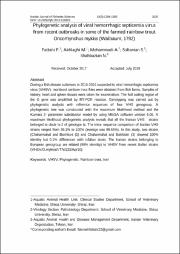 During a fish disease outbreaks in 2015-2016 suspected to viral hemorrhagic septicemia virus (VHSV), moribund rainbow trout fries were obtained from fish farms. Samples of kidney, heart and spleen tissues were taken [X1] for examination. The full coding region of the G gene was amplified by RT-PCR reaction. Genotyping was carried out by phylogenetic analysis with reference sequences of four VHS genogroup. A phylogenetic tree was constructed with the maximum likelihood method and the Kumara 2- parameter substitution model by using MEGA software version 6.06. A maximum likelihood phylogenetic analysis reveals that all the Iranian VHS strains belonged to clade Ia-2 of genotype Ia. The intra- sequence comparison of Iranian VHS strains ranged from 99.1% to 100% (average was 99.55%). In this study, two strains (Chaharmahal and Bakhtiari (1) and Chaharmahal and Bakhtiari (3) showed 100% identity but 0.1% differences with Isfahan strain. The Iranian strains belonging to European genogroup are related (99% identity) to VHSV from recent Italian strains (VHSV/O.mykiss/I/TN/133/Apr10). [X1]نیازی به ماضی نقلی نیست ، مجهول گذشته ساده صحیح است.