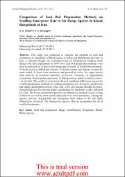 This study was conducted to compare the methods of seed bedpreparation in rangelands of Khash region in Sistan and Baluchestan province inIran. A split plot design was conducted based on Randomized complete blockdesign with three replications in 1999. Five seed bed preparation methods wereused as main plot as: 1) Seed sown by passing livestock. 2) Seed sown machinery.3) Seeds sown as drilled into furrows. 4) Seeds sowing into furrows covered bystraw mulch .5) Seed sown machinery and pressed by roller. Six range specieswere used as: 1) Artemisia santolina, 2) Eurotia ceratoides, 3) Zygophyllumeurypterum, 4) Astragalus squarrosus, 5) Stipagrostis sp. and 6) Artemisia sieberi, as sub-plot. The results of experiment showed significant differences among theseed bed preparation methods on seedling emergence rate. Astragalus and Eurotiahad higher germination percent when they sown and passing through livestock.Zygophyllum and Eurotia had higher germination by machinery seeder followedby roller. The lowest germination percent was obtained by method of seed sowingin furrows covered by straw mulch and seeds were sown machinery. Among thespecies, Eurotia, Zygophyllum and Astragalus were ranked in the first orderfollowed by Artemisia. The Stipagrostis species. Had no germination for all ofseed bed treatments.