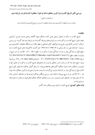 تاریخ کاشت و تراکم از عوامل زراعی تعیین کننده عملکرد بهینه گیاهان زراعی هستند بنابراین آزمایشی جهت تعیین تاریخ کاشت و تراکم مناسب در ژنوتیپهای پیشرفته گندم نان در شرایط دیم اجرا گردید. این بررسی در قالب آزمایش فاکتوریل و طرح پایه بلوکهای کامل تصادفی با چهار تکرار در ایستگاه تحقیقات کشاورزی دیم سرارود- کرمانشاه طی سه سال زراعی از 86-1385 تا 88-1387 اجرا گردید. فاکتورها شامل تاریخ کاشت با دو سطح (قبل از بارندگی مؤثر و بعد از بارندگی مؤثر)، تراکم با سه سطح (250، 400 و 550 بذر در متر مربع) و ژنوتیپ با چهار سطح (V1: Ww33G/Vee"S"//Mrn/4/HD2172/Bloudan //Azd/3/San/Ald"s"//Avd،V2 : (ریژاو)PATO/CAL/3/7C//BB/CNO/5/ CAL//CNO ،V3 : (اوحدی)14 Gene bank و V4: سرداری) بودند. نتایج نشان داد که در سال با تنش خشکی شدیدتر، اثر عاملهای تاریخ کاشت و تراکم و اثر مقابل آنها با ژنوتیپ بر عملکرد دانه و اجزاء عملکرد گندم قابل ملاحظه میباشد. با در نظر گرفتن عملکرد دانه بطور کلی تاریخ کاشت قبل از بارندگی مؤثر در کرمانشاه توصیه میگردد و با توجه به عدم اثر معنیدار تراکم بر عملکرد دانه میزان بذر 400-250 بذر در متر مربع میتواند استفاده شود. بررسی میانگین عملکرد ژنوتیپها در سالهای آزمایش نشان داد که رقم ریژاو در سالهای خوب ژنوتیپ برتر و در سالهای خشک عملکرد قابل قبول در مقایسه با رقم شاهد سرداری داشت.