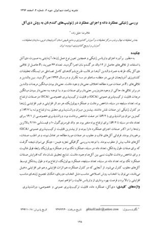 به منظور برآورد اجزای واریانس ژنتیکی و همچنین تعیین نوع عمل ژنها، آزمایشی به صورت دیآلل با استفاده از تلاقیهای حاصل از 12 والد در گندم نان اجرا گردید. تعداد 66 هیبرید F2 حاصل از تلاقی دیآلل یک طرفه به همراه والدین آنها در قالب طرح بلوکهای کامل تصادفی در ایستگاه تحقیقات کشاورزی آذربایجان غربی در منطقه ساعتلو در سه تکرار و در سال 1392 اجرا گردید. بین والدین و تلاقیهای F2 در صفات مورد مطالعه اختلاف معنیدار وجود داشت. معنیدار بودن میانگین مربعات والدین در برابر تلاقیها، حاکی از وجود هتروزیس معنیدار برای صفات بود. با توجه به معنیدار بودن میانگین مربعات قابلیت ترکیبپذیری عمومی (GCA) و قابلیت ترکیبپذیری خصوصی (SCA) در صفات ارتفاع بوته، تعداد سنبلچه در سنبله، شاخص برداشت و عملکرد بیولوژیک، هر دو اثر افزایشی و غیر افزایشی ژنها در کنترل ژنتیکی این صفات نقش داشتند. بیشترین میزان وراثتپذیری متعلق به ارتفاع بوته با 7/83% و کمترین میزان وراثتپذیری با 2/54% در صفت شاخص برداشت بود. وراثتپذیری خصوصی از 1/16 برای تعداد دانه در سنبله تا 2/54% برای ارتفاع بوته متغیر بود. دو والد قیرمزیگول-1 و قیمتلی-17/2 بالاترین رتبهها را در اکثر صفات اجزای عملکرد دارا بوده و از بیشترین قابلیت ترکیبپذیری عمومی (GCA) برخوردار بودند. فراوانی آللهای غالب و مغلوب در صفات مورد مطالعه در تعادل نبوده و در اغلب صفات، آللهای غالب بیش از مغلوب بودند. با توجه به بررسی گرافیکی تجزیه هیمن- جینکز میتوان نتیجه گرفت که برای صفات طول پدانکل، تعداد دانه در سنبله، عملکرد تک بوته و عملکرد بیولوژیک رابطه فوق غالبیت و برای شاخص برداشت غالبیت نسبی بین آللها وجود داشت. نتایج تحقیق نشان داد که افزایش صفات عملکرد تک بوته، تعداد دانه در سنبله، تعداد سنبلچه، عملکرد بیولوژیک، ارتفاع بوته و طول پدانکل توسط آللهای مغلوب کنترل میشود. از آنجایی که در کنترل عملکرد، هم اثرات افزایشی و هم غیر افزایشی دخیل میباشند، میتوان با انتخاب روش اصلاحی مناسب مثل انتخاب دورهای، امکان تجمیع ژنهای مناسب افزایشی را بالا برد و فرصت بهره برداری از واریانس غالبیت را فراهم نمود.
