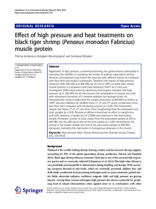 Application of high pressure, a minimal processing, has gained interest particularly in extending the shelf-life or modifying the texture of seafood, especially in shrimp. However, pressurization may render the products with different texture as compared with their fresh and heated counterparts. Therefore, the impact of high-pressure treatment (200, 400, 600, and 800 MPa for 20 min at 28°C) on black tiger shrimp muscle proteins in comparison with heat treatment (100°C for 2 min) was investigated. Differential scanning calorimetry thermogram indicated that high pressure up to 200 MPa for 20 min induced the denaturation of myosin and actin with subsequent formation of a network stabilized by hydrogen bond. An electrophoretic study revealed that the sample pressurized at 800 MPa or heated at 100°C was also stabilized by disulfide bond. L*, a*, and b* values, compression force, and shear force increased with increasing pressure (p L*, a*, b*, and shear force (toughening) than the pressurized and fresh samples (p p ≥ 0.05). However, a weight loss of 27.89% was observed in the heat-treated sample. Proteolytic activity of crude extract from the pressurized sample at 200 to 600 MPa did not differ from that of the fresh sample (p