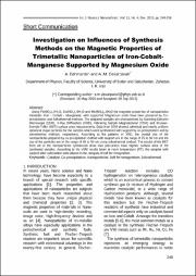 Using Fe(NO3)3.9H2O, Co(NO3)2.6H2O and Mn(NO3)2.4H2O the magnetic properties of nanoparticles trimetalic Iron - Cobalt - Manganese, with supported Magnesium oxide have been prepared by Co-precipitation and Solvothermal methods. The prepared samples are characterized by Scanning Electron Microscope (SEM), X-Ray Diffraction (XRD), Vibrating Sample Magnetometer (VSM) and Brunaer-Emmett-Teller (BET) surface area measurements. Data from SEM showed spherical and nearly uniform spherical shape particles for the samples which were synthesized with support by co-precipitation and by solvothermal methods, respectively. According to the patterns of XRD, the crystal size of the nanoparticles prepared by co-precipitation method with support are in the range of 25 to 30 nm and the size of the particles are in the range of 45 to 50 nm using solvothermal method. The results of the BET from all of the nanoparticles synthesized show that precursors have highest surface area of the calcinated samples. According to the VSM results taken at room temperature (RT), the samples with support after calcination were placed in the category of soft ferromagnetism.