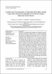In this work, hydrophobic silica aerogels were synthesized using sol-gel method and drying at ambient pressure. The surface morphology, pore size, and the presence of functional groups on the surface of the nanoparticles were analyzed using FE-SEM, TGA, FT-IR, and EDX, respectively. After calcination at 500 °C, the hydrophilic property of the adsorbents was evaluated by water contact angle measurements. The calcinated silica aerogels were used for adsorption of nitrate from aqueous solution in both batch and continuous processes. In the batch process, the effect of initial nitrate concentration, contact time, pH level, and adsorbent dosage were investigated. Results showed that the nitrate removal percentage increased with the decrement of the pH level and the initial nitrate concentration. On the other hand, increasing the contact time and the adsorbent dosage resulted in higher removal percentage. Accordingly, process optimization resulted in a nitrate removal of 92.2 %. Furthermore, it was found that the equilibrium results were in agreement with the Langmuir isotherm model better than with the Freundlich model and also the adsorption kinetics followed the pseudo-second-order model. In the continuous process, the effects of the input flow rate, the bed height, and the initial nitrate concentration were investigated.