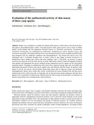 Studies were conducted to evaluate the antimicrobial potency of skin mucus collected from three carp species; Hypophthalmichthys nobilis, Ctenopharyngodon idella, and Cyprinus carpio (exotic to India) against certain human and fish pathogenic bacterial strains viz. Klebsiella pneumoniae, Pseudomonas aeruginosa, Escherichia coli, Staphylococcus epidermidis, Staphylococcus aureus, Bacillus cereus, and Aeromonas hydrophila. The antimicrobial activities were measured in terms of zone of inhibition (ZOI) in mm and compared with two antibiotics (amikacin and chloramphenicol). All selected fish species were also challenged with A. hydrophila through water to check, if there is any change in mucus secretion or its antibacterial effects. Studies have shown that after challenge with A. hydrophila, an increase in mucus secretion was observed in all the three species of carps. Skin mucus extracts (crude and aqueous) obtained from healthy and challenged fish species exhibited strong antibacterial activity against all the investigated microbial strains. Variations in antibacterial effect have been observed among same fish (in healthy and challenged) and amidst different carp species against same and different bacterial strains. In general, crude mucus of all the fish species showed higher bactericidal action than its aqueous extracts and antibiotic chloramphenicol. Hence, these results have clearly revealed that the mucus obtained from fish skin shows antibacterial activity which may play an important role in fish protection against pathogens and thus there appears to be a possibility of using mucus obtained from the skin of carps as an alternative to antibiotics in animals and possibly also in human health related problems.