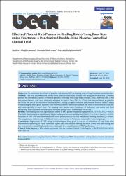 Objective: To determine the effects of platelet rich plasma PRP on healing rates of long bone non-union fracture.Method: This was a randomized double-blind placebo controlled clinical trial being performed in a 12-month period. We included 75 adult (>18 years) patients suffering from long bone (Femur, Tibia, Humerus and Ulna) non-union fracture who were randomly assigned to receive 5mL PRP (n=37) or 5mL normal saline as placebo (n=38) in the site of fracture after intramedullary nailing or open reduction and internal fixation (ORIF) along with autologous bone graft. Patients were followed each 45 days till 9 months and were evaluated both clinically and radiologically in each visit. The healing rate, failure rate, incidence of infection, mal-union and limb shortening were recorded and compared between groups after 9 months of follow-up.Results: The healing rate was significantly higher in PRP group compared to placebo (81.1% vs. 55.3%; p=0.025). The limb shortening was significantly higher in those who received placebo (2.61±1.5 vs. 1.88±1.2mm; p=0.030). Injection of PRP was also associated with lower pain scores (p=0.003) and shorter healing duration (p=0.046). The surgical site infection (p=0.262) and mal-union rate (p=0.736) were comparable between groups.Conclusion: Application of PRP along with autologous bone graft in the site of non-union of long bone after intramedullary nailing or ORIF results in higher cure rate, shorter healing duration, lower limb shortening and less postoperative pain. Higher infection rate might be a complication of PRP application.Keywords: Non-union; Long bone Fracture; Platelet rich plasma (PRP); Intramedullary nailing; Open reduction and internal fixation (ORIF).Clinical Trial Registry: This trial is registered with the Iranian Clinical Trials Registry (IRCT201208262445N1; www.irct.ir).